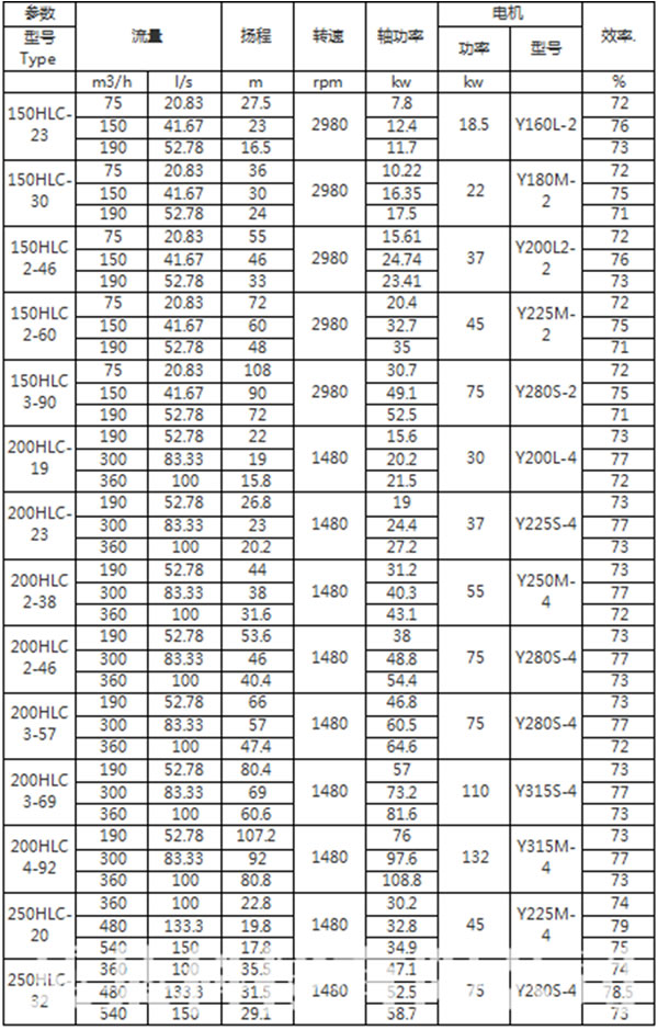 | 例如:300HLC2-50A 300—泵出口直径为φ300mm HLC—立式长轴泵 2—叶轮级数为2级(级数为1时略) 50—设计点扬程为50m A—叶轮外径切割代号 |